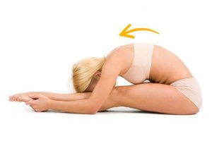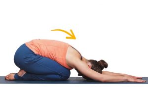 Uklęknij na kolanach, a ręce wyciągnij przed siebie tworząc pozycję dziecka. Ta pozycja pomaga Ci się zrelaksować oraz odciąża dolną część pleców. Uklęknij z lekko rozstawionymi nogami. Tułów powoli przechyl do przodu tak, aby ręce dotykały podłoża. Postaraj się napiąć ciało, czoło „przytul” do podłoża.