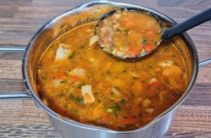 Następnie ziemniaki pokroić w kostkę i dodać do garnka wraz z solą, pieprzem, papryką i rozmarynem. Dodać fasolę z puszki bez marynaty i zalać 1 litrem wody. Mieszamy i gotujemy pod przykryciem przez 15 do 20 minut. Na koniec posiekać natkę pietruszki i koperek, dodać do zupy i podawać.