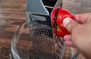 Marchewkę, czerwoną i zieloną paprykę, pieczarki, ostrą paprykę i czosnek kroimy na mniejsze kawałki i wszystko wrzucamy do garnka. Następnie przekrój pomidory i zetrzyj je na grubej tarce, pozostawiając jedynie skórkę, której nie używasz. Włóż pomidory do garnka, przykryj i gotuj wszystko na małym ogniu przez około 15 minut.