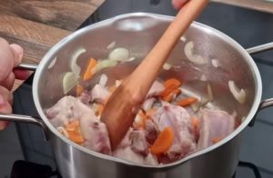 Boczek kroimy na mniejsze kawałki i podsmażamy na odrobinie oleju w większym garnku. Następnie dorzucić cebulę pokrojoną w paski i na koniec żeberka wieprzowe pokrojone na mniejsze kawałki z odpowiednią ilością mięsa. Smażymy wszystko na dużym ogniu przez około 3 do 5 minut i mieszamy.