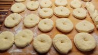 Zawiń ciasto w rulon. Jeśli się przyklei, użyj trochę oleju, nie posypuj go. Rozwałkuj go na placek o grubości około centymetra i okrągłym nożem wytnij muffiny. Następnie zrób dziurkę w środku każdego z nich palcem. Pozwól im rosnąć przez 15 minut.