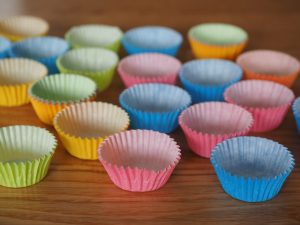 Przygotujemy papierowe kubki. Ciastem napełnij foremki na muffinki. Wypełniamy tylko do około 2/3.