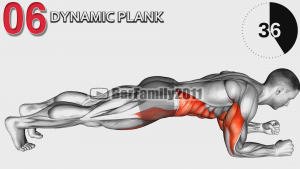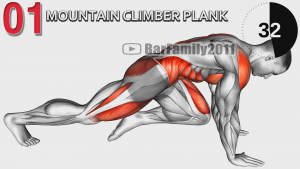 Rozpocznij od pozycji deski, przeciągając naprzemiennie kolana do przeciwnej ręki, z wyprostowanymi ramionami i napiętym brzuchem. Oddychaj równomiernie przez 45 sekund.