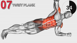 Obracaj ciało i podnoś ramię, opierając się na łokciach, przez 45 sekund.