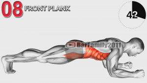 Pozostawaj w pozycji deski przez 60 sekund, opierając dłonie na łokciach i utrzymując ciało w równej linii. Patrz w dół.