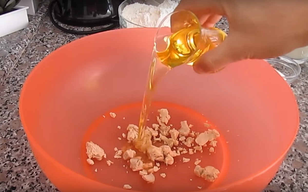 Odlej około 150 ml oleju i zalej nim pokruszone drożdże. Zalej mlekiem, dodaj soli i dobrze wymieszaj. Powstanie płynna masa, do której dodaj mąkę.