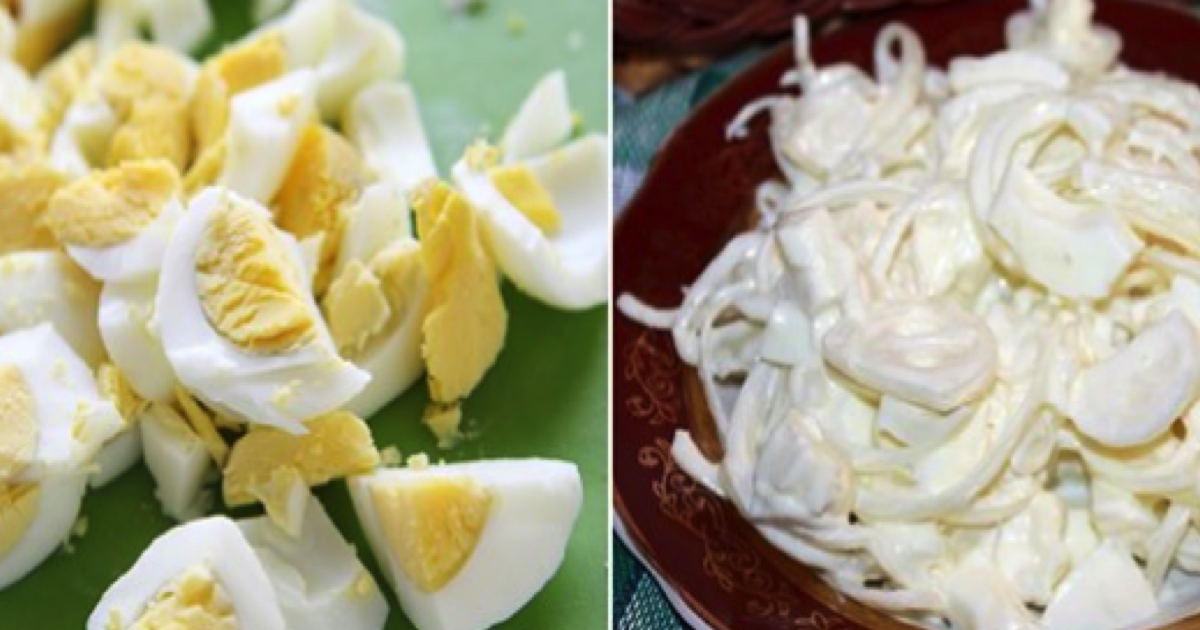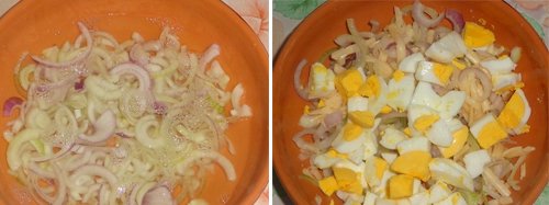 Ugotować jajka na twardo, poczekać aż wystygną i pokroić je w kostkę. Następnie obrać cebule i pokroić wszystkie w „piórka”. Tak przygotowaną cebulę zalać gorącą wodą i odstawić na 10 minut do zmiękczenia. W tym czasie wymieszać w szklance ciepłej wody sól, ocet i cukier.
