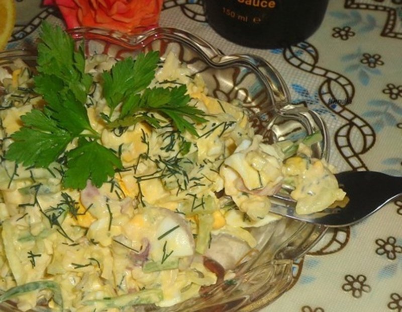 Tak przygotowaną mieszanką zalać zmiękczoną i odcedzoną cebulę i odstawić na 15-20 minut. Po upłynięciu czasu odcisnąć cebulę, wymieszać ją z jajkami i majonezem. Przyprawić wedle uznania.