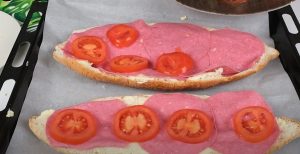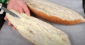 Użyj jakiegoś białego chleba, prawdopodobnie bagietka też by się nadała. Przetnij go wzdłuż na pół i rozpłaszcz na desce do krojenia, aby nie był zbyt gruby, a powierzchnia na składniki była jak największa. Obie połówki smarujemy cienką warstwą masła i układamy na blaszce wyłożonej papierem do pieczenia.