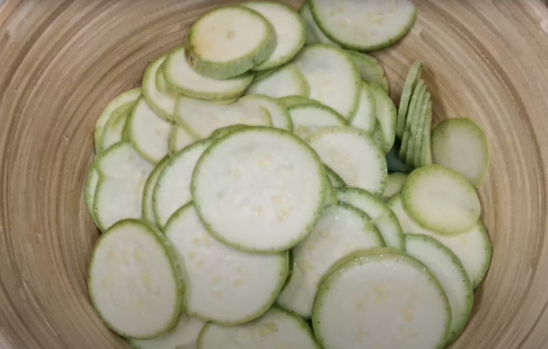 Jeśli masz już wszystkie składniki na blacie, to najpierw umyj cukinię, bo nie trzeba będzie jej obierać ze skóry. Umyte warzywo pokrój w jak najcieńsze talarki. Na zakupach zwróć uwagę czy kupujesz młodą czy starą cukinię – ważne jest to, żeby nie było w niej pestek.