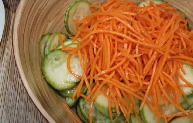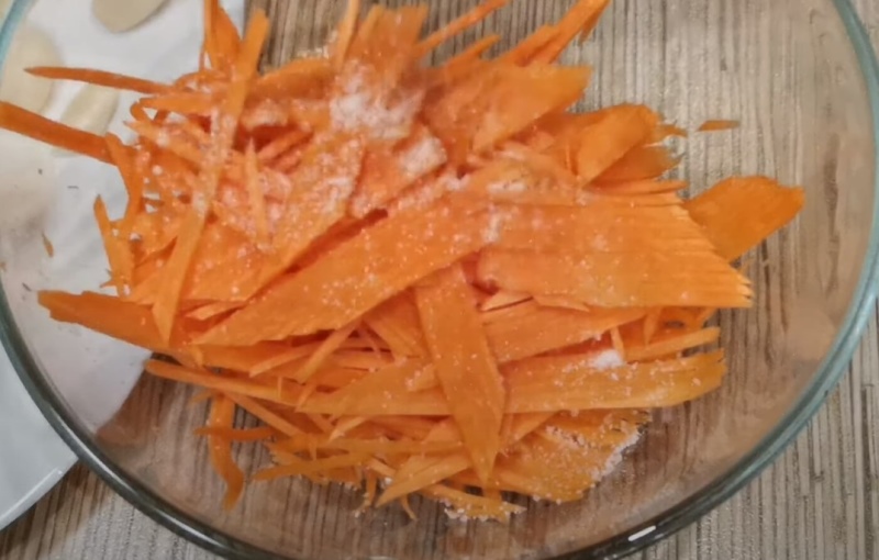 W trakcie gdy cukinia odpoczywa, należy zabrać się za obieranie marchewki. Jeśli posiadasz w domu specjalną tarkę do marchewki po koreańsku to zaoszczędzisz sobie czas, jeśli nie to pokrój ją w paski. Z marchewką zrób to samo co z cukinią, odłóż do miski, posyp szczyptą soli, wymieszaj i odstaw na pół godzinki.