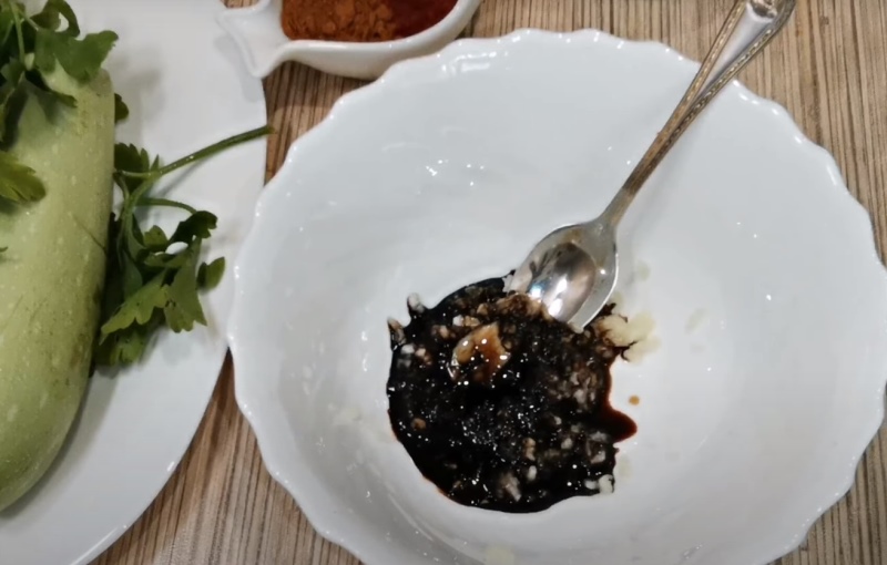 W między czasie obierz i zetrzyj 4 ząbki czosnku, następnie włóż przetarty czosnek do miseczki i zalej sosem sojowym i sokiem z cytryny. Rozmieszaj to wszystko, po czym zacznij dodawać przyprawy: mieloną słodką i ostrą paprykę, na samym końcu dodaj miód i wymieszaj tak, aby miało konsystencję dressingu.