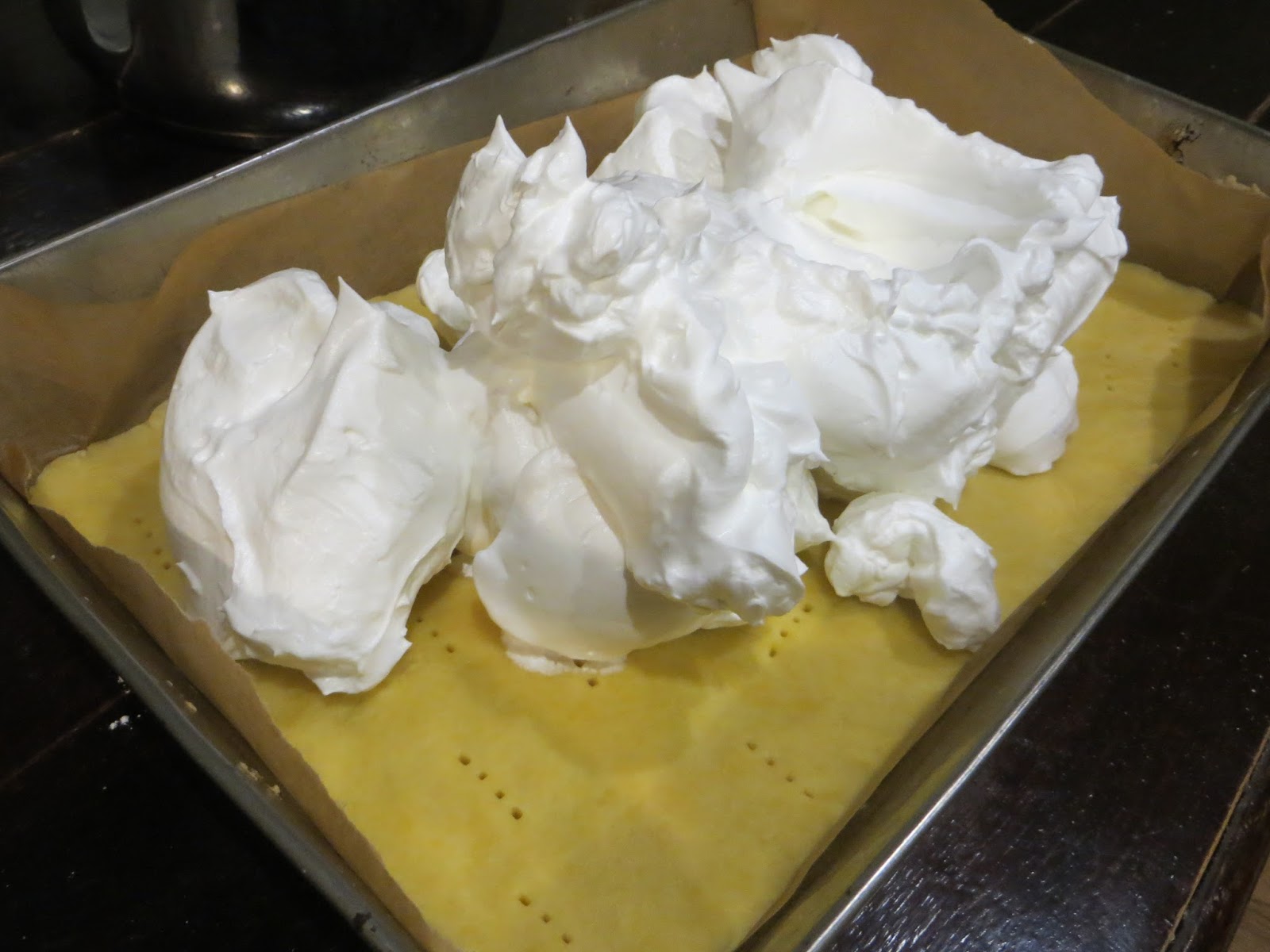 Na koniec przykrywamy śmietankową warstwę kruchym ciastem z migdałami, tak by część migdałowa stykała się ze śmietaną.