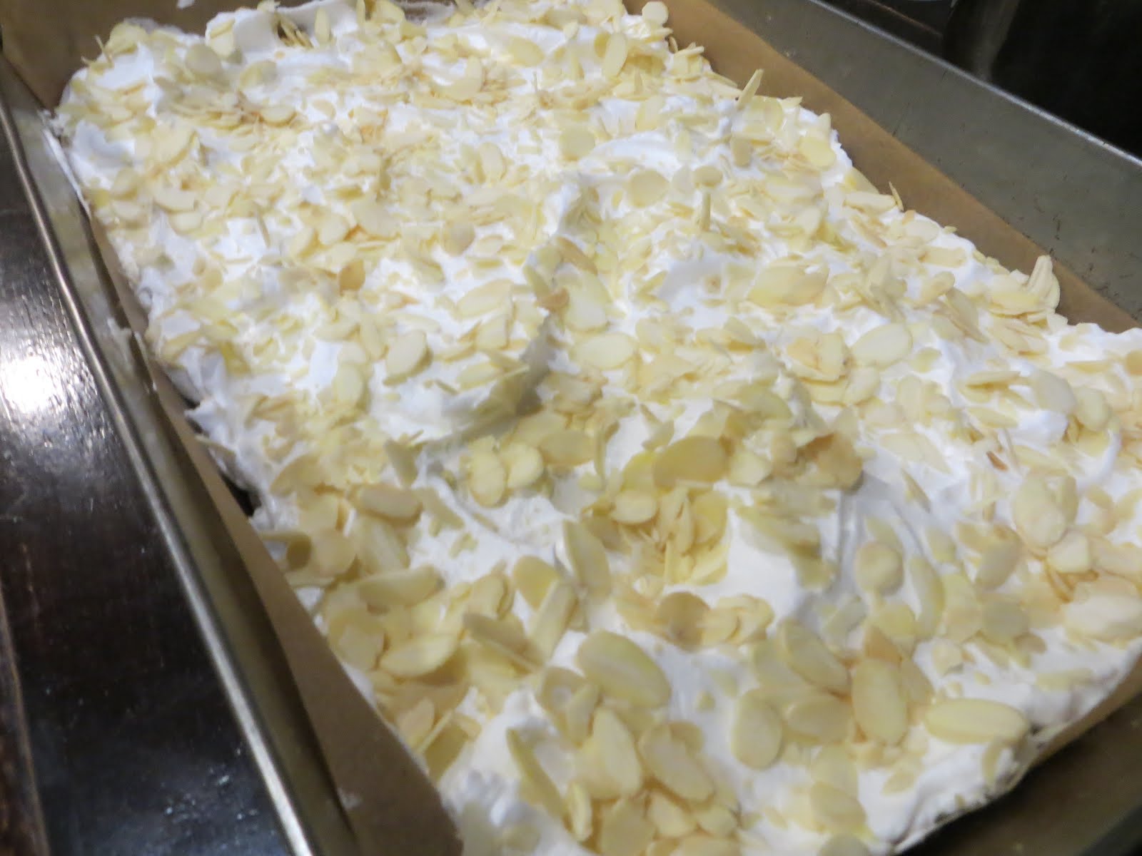 Białka ubijamy na sztywną pianę z cukrem pudrem. następnie wykładamy na nieupieczone ciasto i posypujemy płatkami migdałów. Pieczemy 34-40 minut w piekarniku nagrzanym do 170 stopni. Po upieczeniu dajemy ciastu ostygnąć.