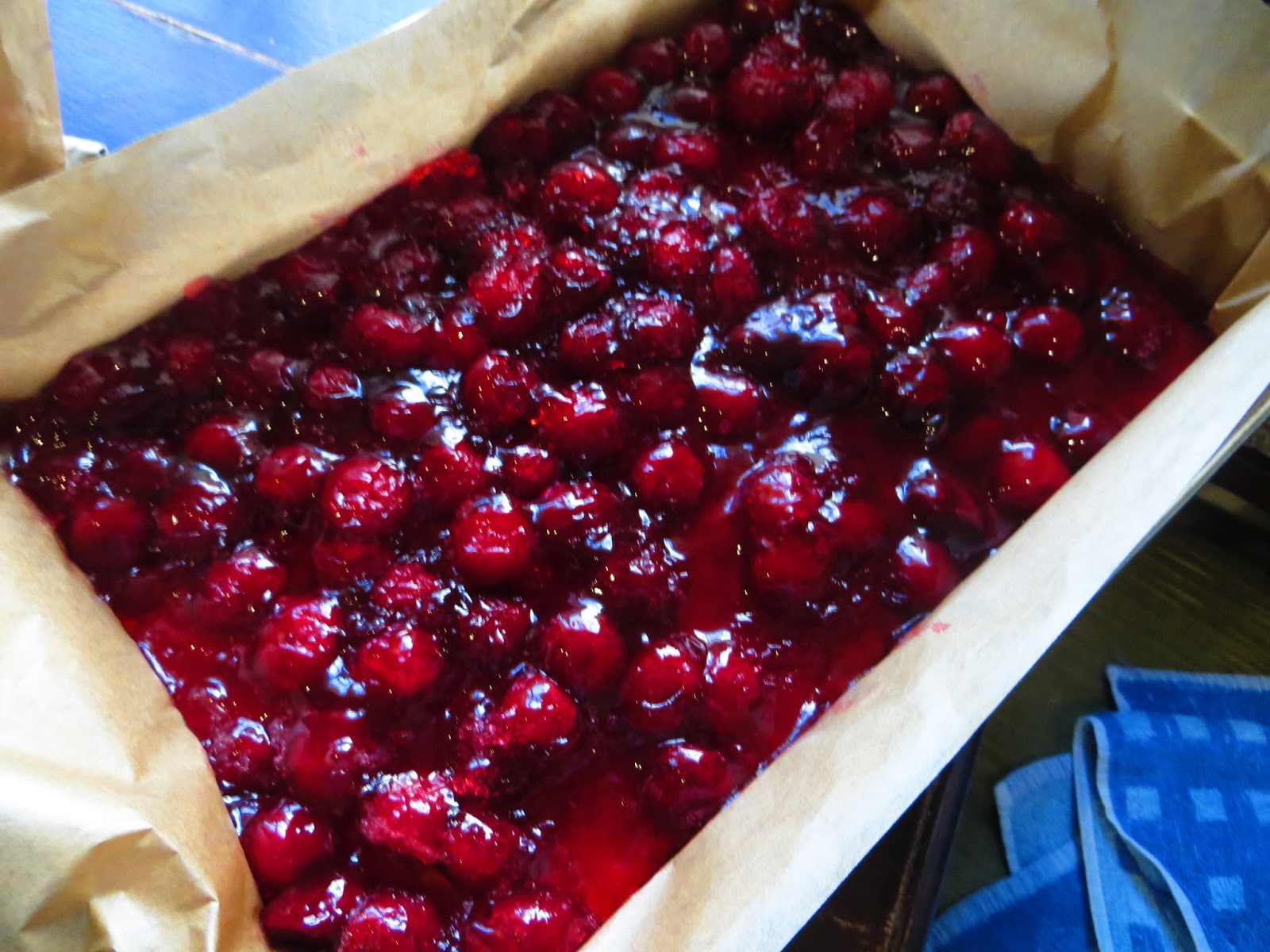 Żelatynę z galaretkami rozrabiamy w gorącej wodzie, dodajemy sok wiśniowy. Czekamy aż płyn ostygnie, po czym dodajemy wiśnie, dokładnie mieszamy i całości wylewamy na ostudzone kruche ciasto.