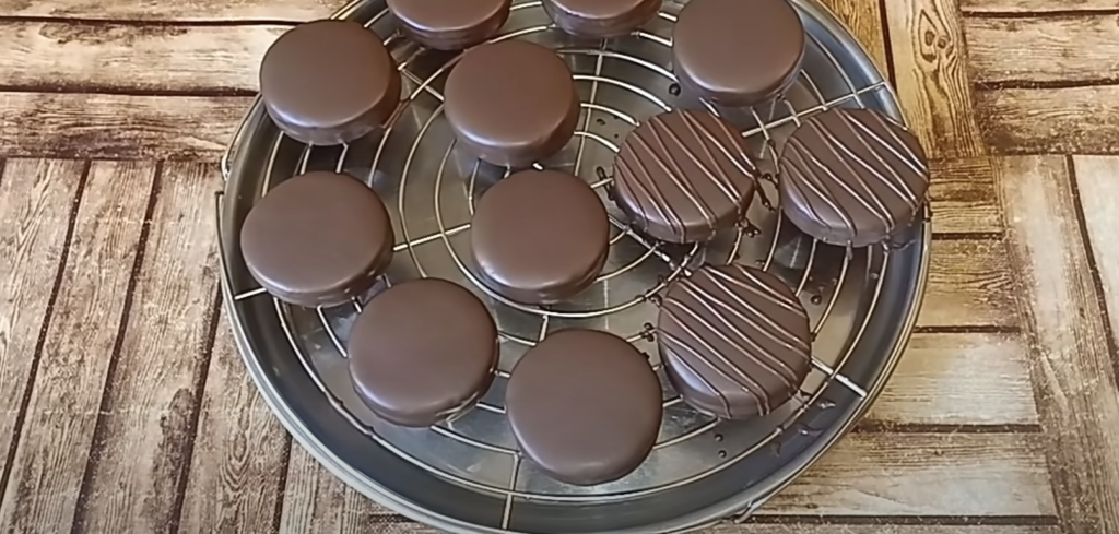 W ostatniej kolejności przygotowujemy polewę. Gorzką czekoladę roztapiamy na małym ogniu z dodatkiem niewielkiej ilości tłuszczu. Z piekarnika wyjmujemy wypieczone spody ciastek. Nakładamy na nie nadzienie – nie należy zbyt długo zwlekać, aby nasza masa nie zastygła. Całość zanurzamy w czekoladowej polewie i gotowe!