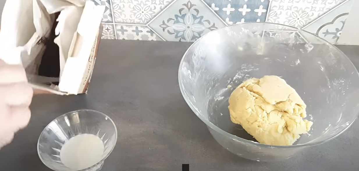 Ugniataj na jednolitą masę, którą podzielisz na dwie połowy. Przygotowujemy mleko, dodajemy kakao i mieszamy. Dodaj mieszankę kakaową do ciasta i wymieszaj.