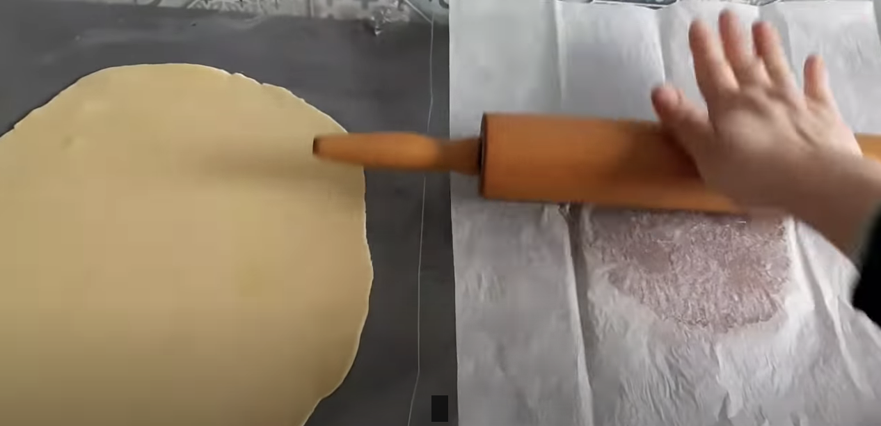Obie połówki ciasta wykładamy na blat wyłożony folią. Na ciasto położyć papier do pieczenia i rozwałkować.