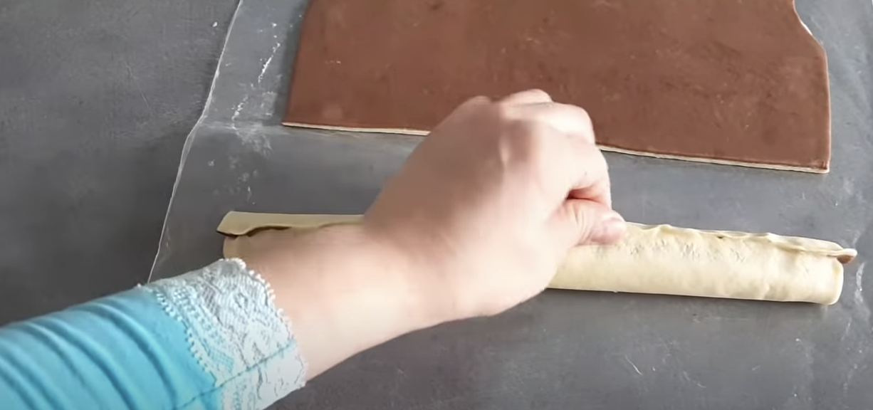 Następnie za pomocą folii zagnij ciemną część ciasta do góry. Teraz dzielimy ciasto na dwie połówki i każdą zwijamy.