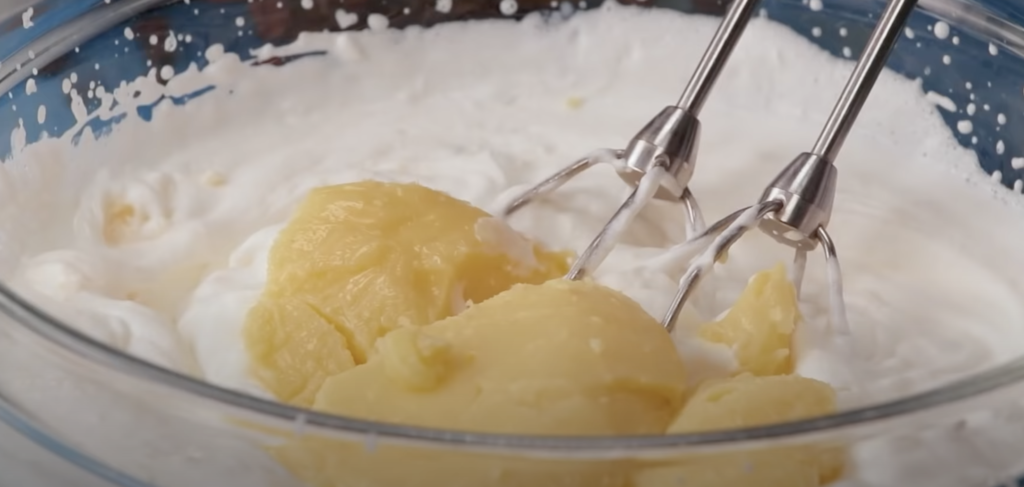 Do budyniu dodajemy śmietanę i mieszamy ponownie.