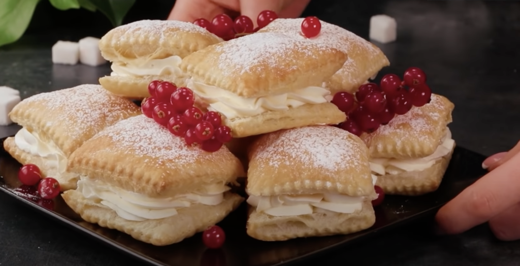 Usmażone ciasto francuskie dzielimy na dwie części i na jedną połowę – za pomocą woreczka cukierniczego – nakładamy krem.