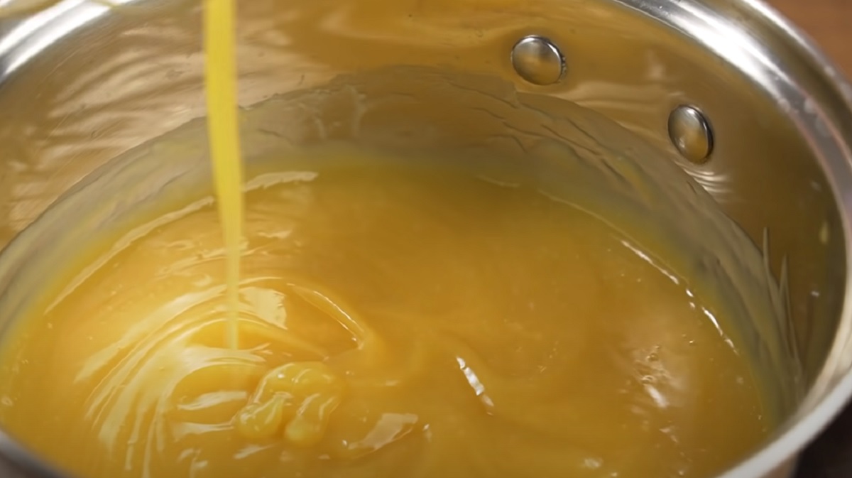 Do wysokiego garnka wlej sok pomarańczowy, dodaj 50g cukru oraz skrobię kukurydzianą. Wszystko podgrzej na małym ogniu, przez 1 minutę dokładnie mieszając.
