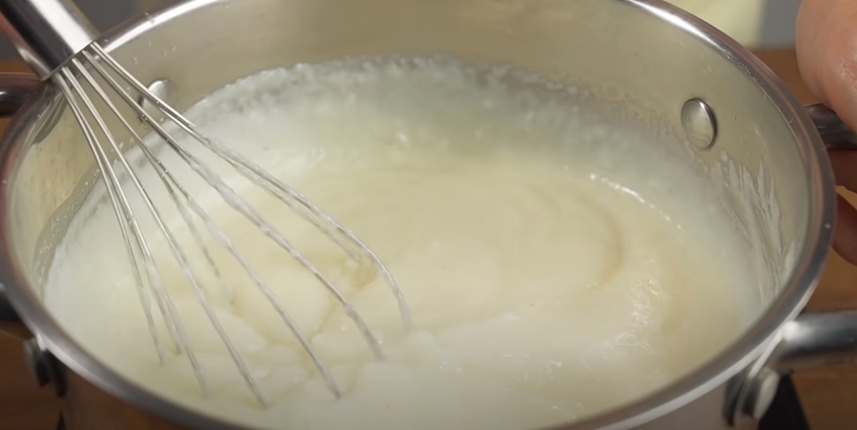 Dokładnie mieszamy masę przez około 1 minutę. Po zdjęciu z ognia dodajemy do białej masy masło, należy dokładnie wszystko wymieszać do uzyskania gładkiej masy.