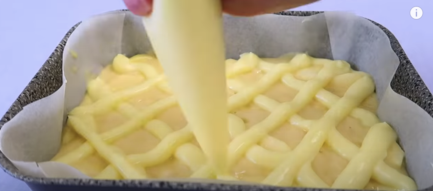 Jabłka obierz, usuń pestki i pokrój w plasterki. Wymieszaj ciasto. Przygotuj formę o wymiarach 18 x 24 cm. Ciasto wlej do formy i za pomocą szprycy cukierniczej stwórz na wierzchu ciasta kratkę ze schłodzonego kremu.