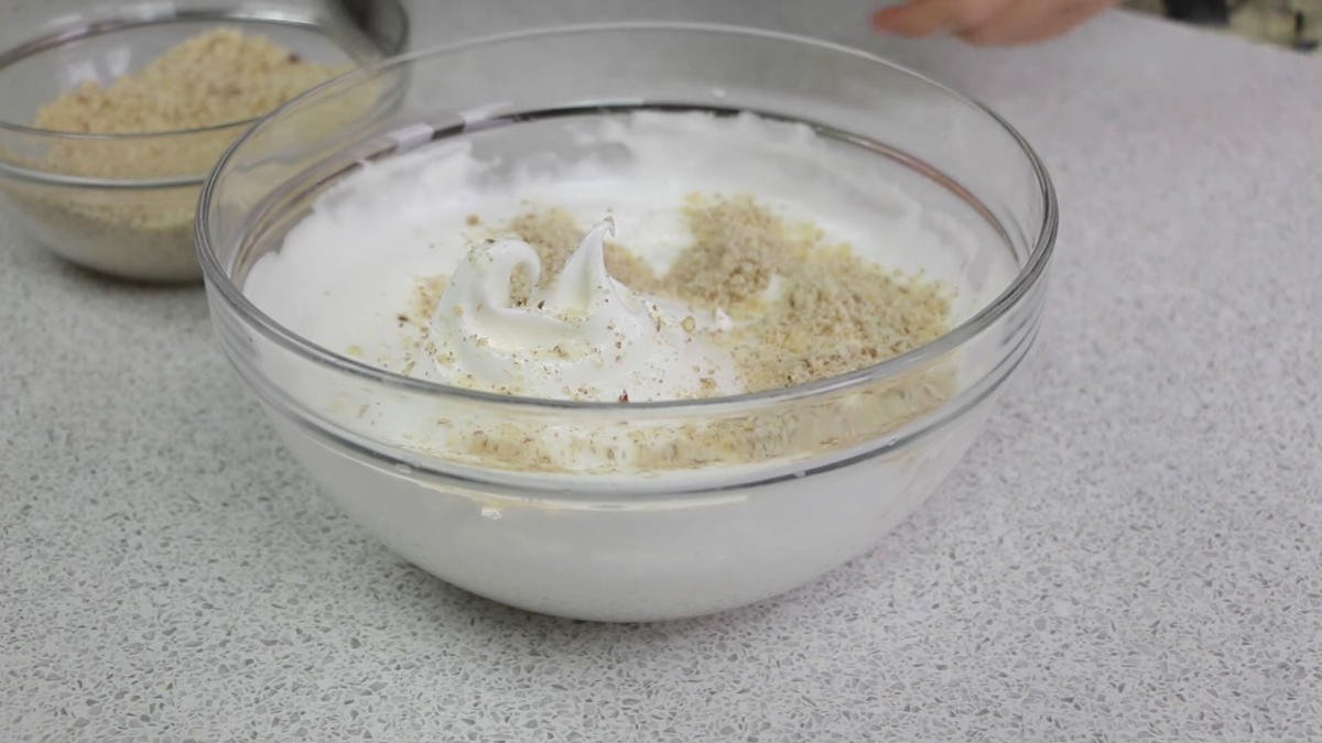 Najpierw przygotuj 3 ciasta. Dla każdego musisz wziąć 3 białka, 2,5 łyżki cukru i pół łyżki mąki i 50 g mielonych orzechów w blenderze. Białka ubić na sztywną pianę, dodać cukier i dalej ubijać. Następnie ostrożnie dodaj mąkę i orzechy i delikatnie mieszaj, aż uzyskasz jednolitą masę.