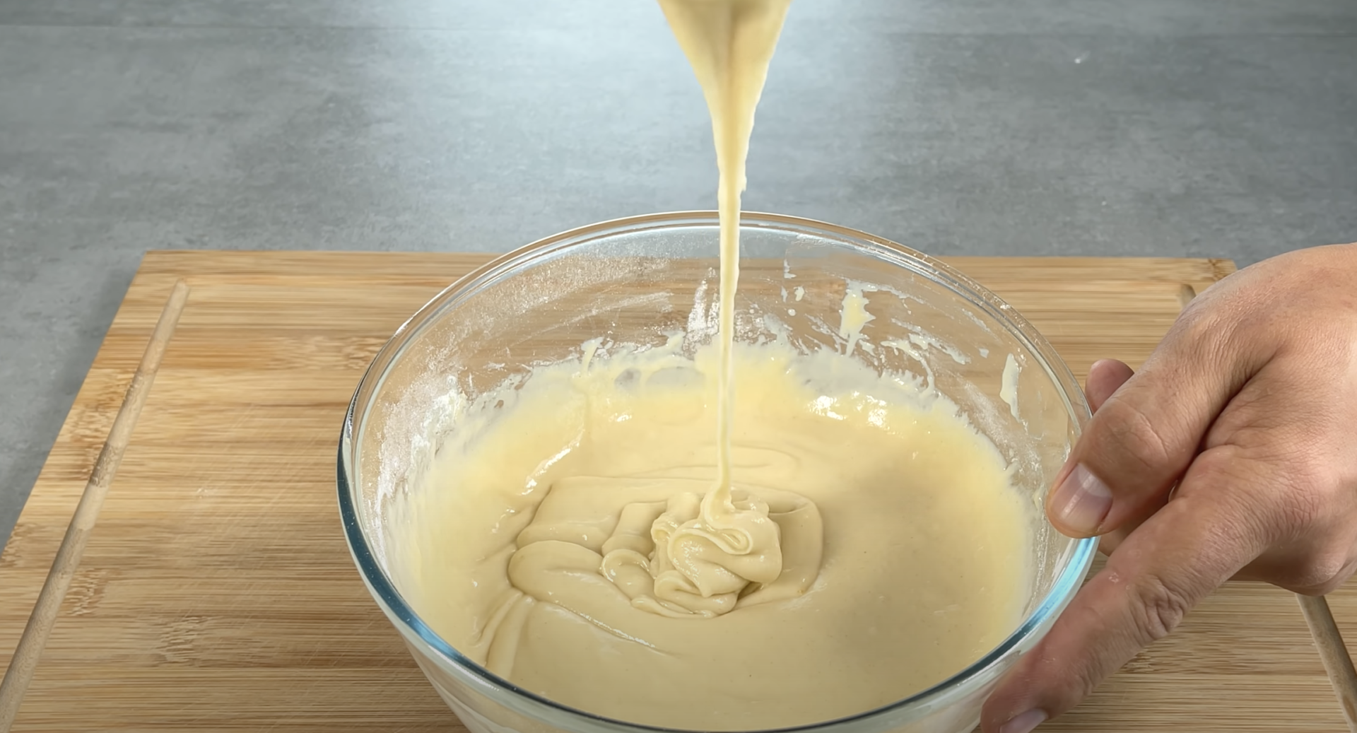 Dodaj olej i mleko. Wymieszaj, aby połączyć wszystkie składniki. Mąkę przesiej razem z proszkiem do pieczenia. Wmieszaj masę jajeczną z mąką, aby uzyskać jednolite ciasto.