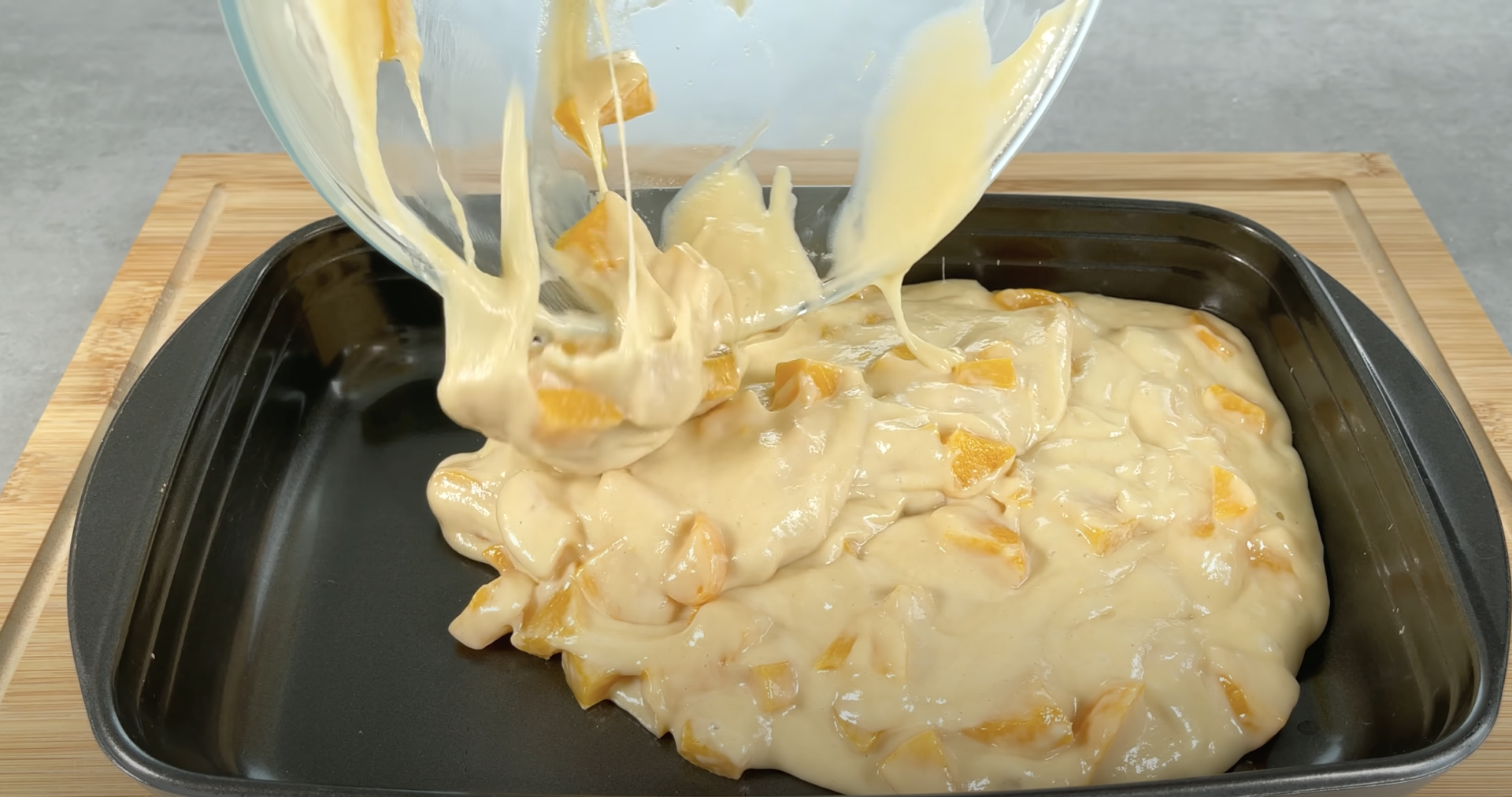 Teraz przygotuj owoce. Pokrój morele lub brzoskwinie w dużą kostkę. Dodaj do ciasta, wymieszaj. Nasmaruj formę do pieczenia olejem.