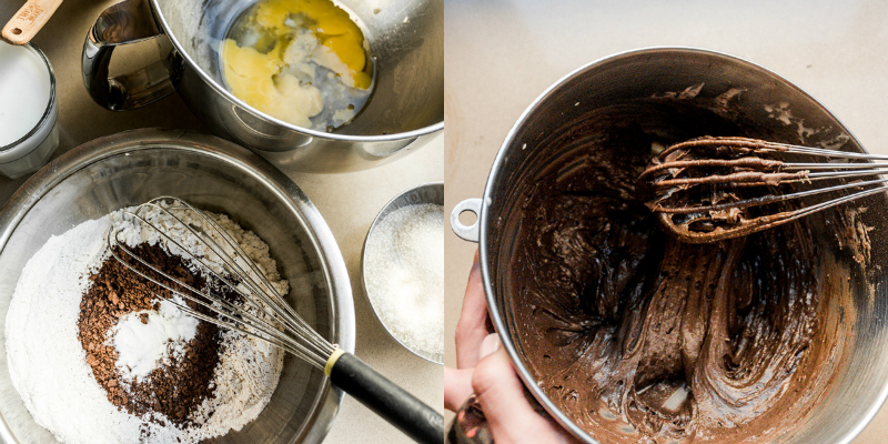 W głębokiej misce wymieszaj kakao, przesianą mąkę i sodę. Osobno ubij jaja ze zwykłym cukrem i waniliowym. Dodaj stopione masło i wymieszaj składniki za pomocą trzepaczki.