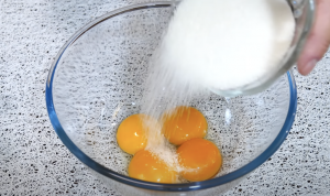 W osobnej misce połącz żółtka z cukrem, używając miksera.