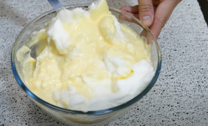 Delikatnie połącz ubite białka z masą żółtek, dbając o zachowanie puszystości.