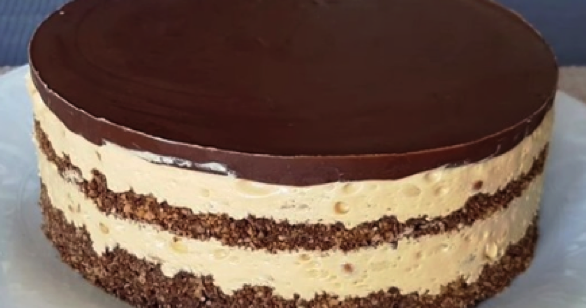 Formę do ciasta wykładamy papierem do pieczenia. Na dno wykładamy pół mieszanki z ciasteczkami. Następnie nakładamy grubą warstwę kremu, znów warstwę z ciasteczkami i resztę kremu. Wyrównujemy górę ciasta i wkładamy je do lodówki w celu schłodzenia.