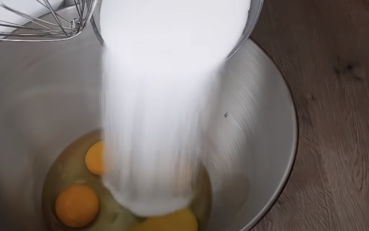 Do miski wbijamy jajka, dodajemy cukier i wszystko zaczynamy ubijać.