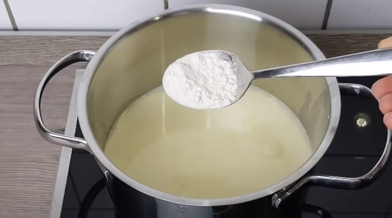 Do garnka wlewamy mleko, dodajemy cukier, olej i skrobię.