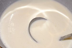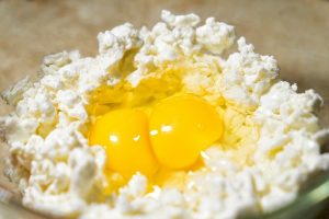 3. Przygotuj nadzienie do naleśników – zmiel twaróg z cukrem, który pozostał po przygotowaniu ciasta, oraz żółtkami.