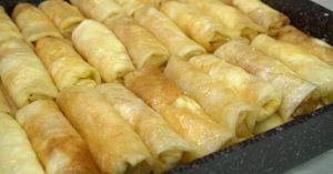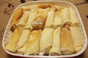 4. Na każdego naleśnika nałóż porcję nadzienia i zawiń w rulon, chowając krawędzie do środka. Tak przygotowane naleśniki włóż do formy do pieczenia i polej roztopionym masłem. Całość piecz w piekarniku nagrzanym do 180°C przez ok. 25 minut.