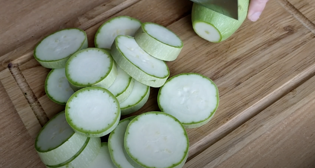 Cukinię umyj i pokrój w grubsze plastry.