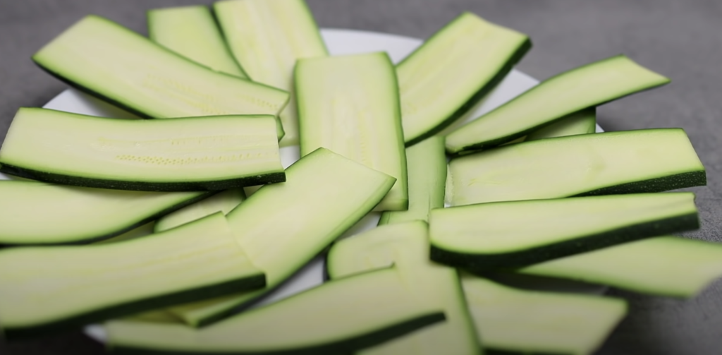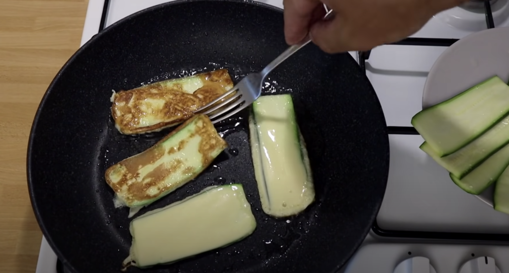 Kawałki cukinii obtocz w cieście. Natychmiast usmaż na patelni z odrobiną rozgrzanego oleju.