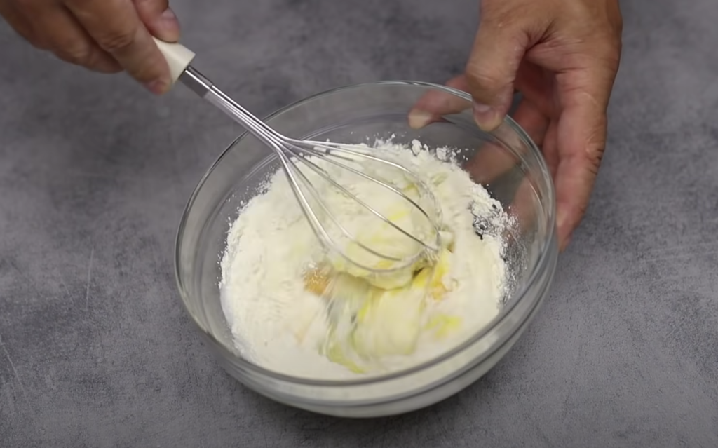 W misce wymieszaj jajka i kefir. Dodaj mąkę i mieszaj do uzyskania jednolitej masy.