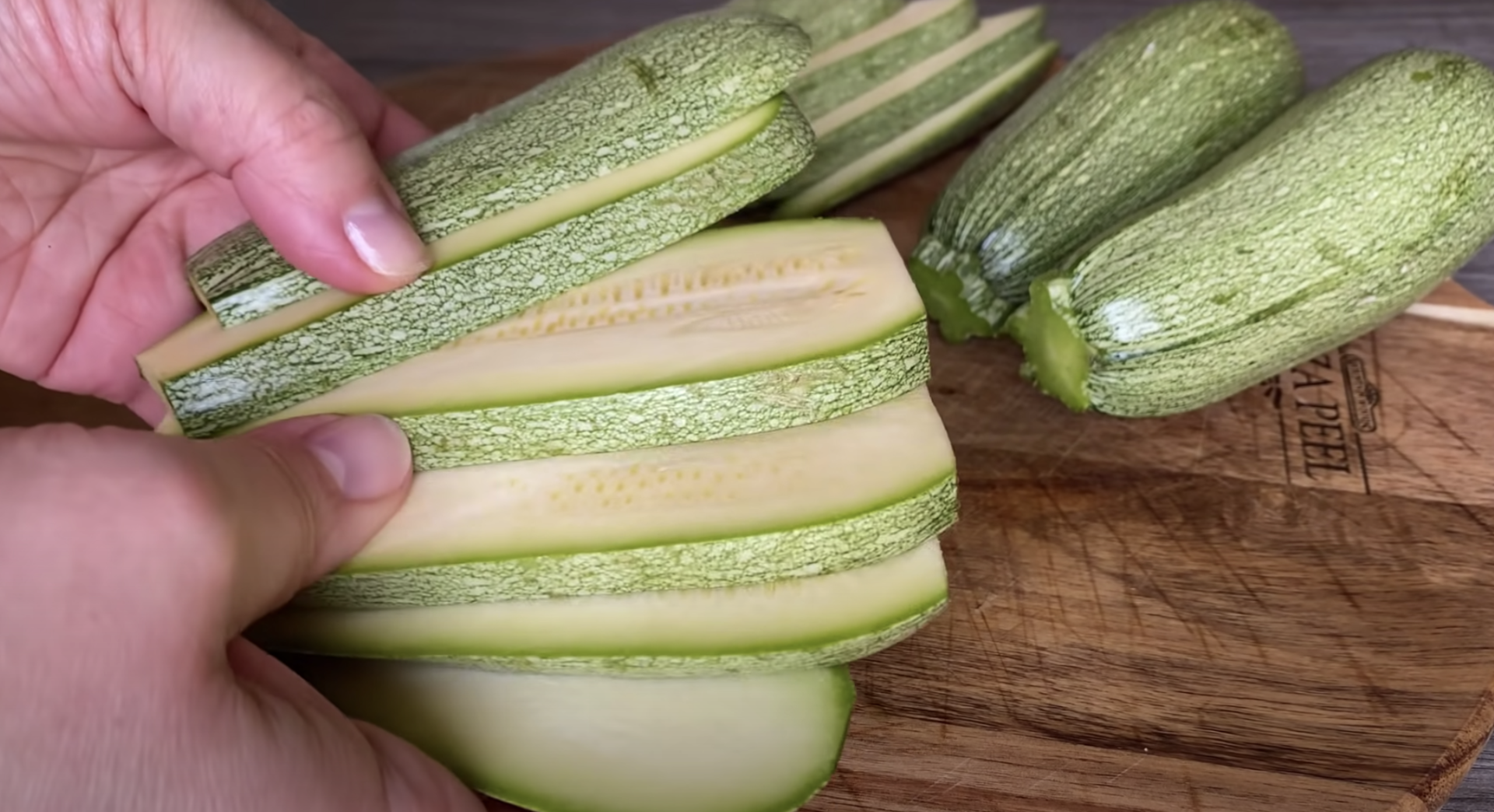 Na początku należy umyć cukinię. Następnie oszyć i pokroić w plasterki.
