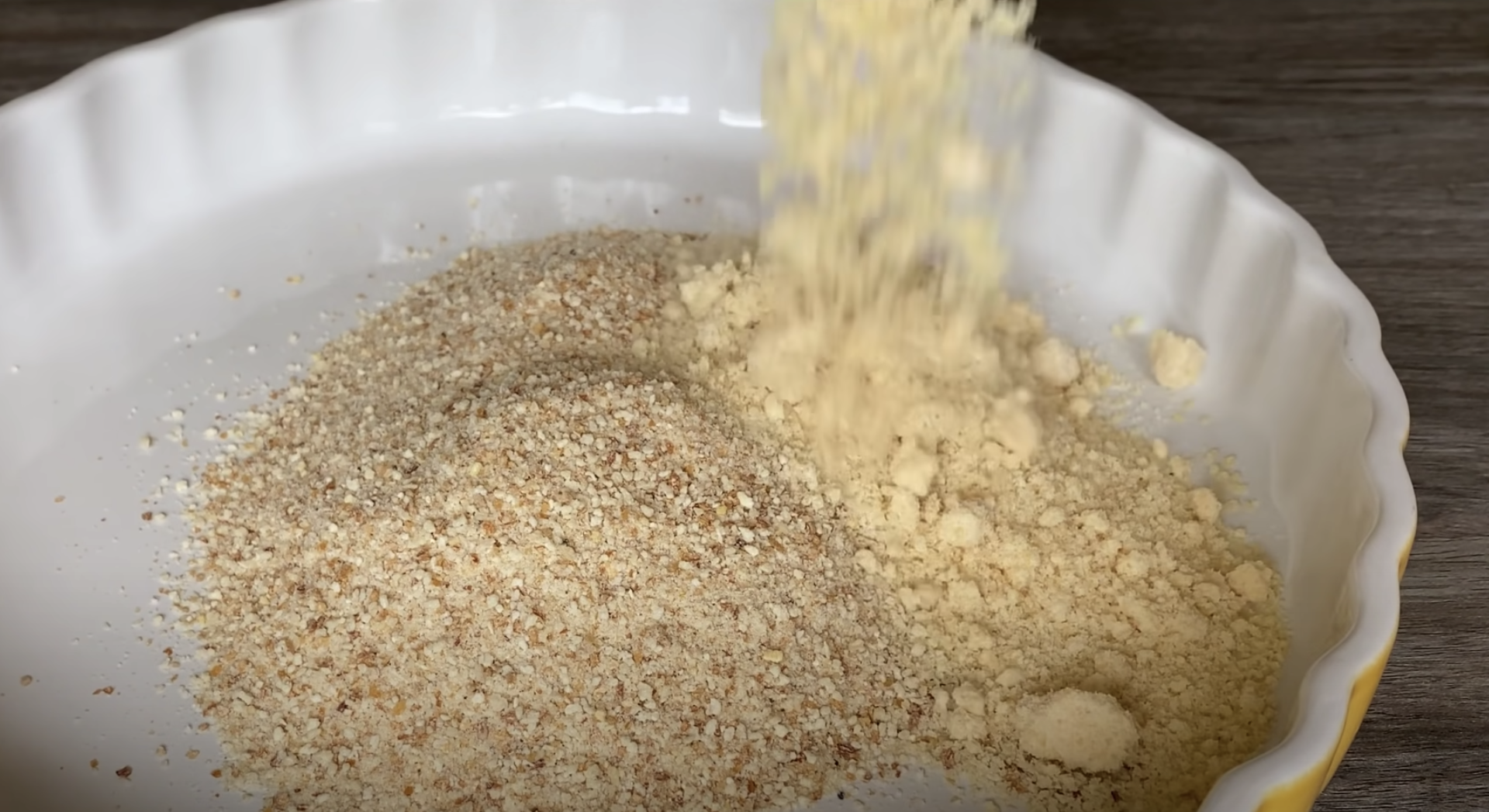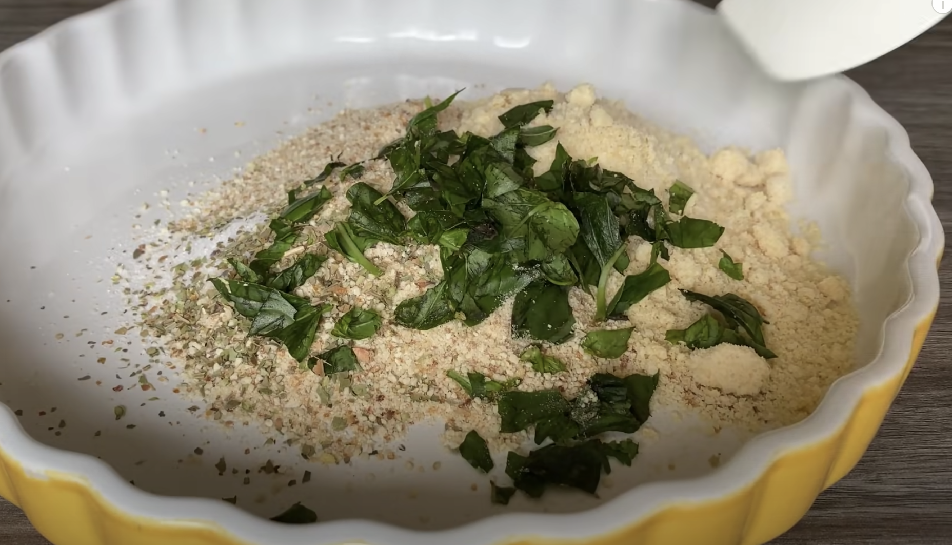 W misce należy wymieszać bułkę tartą z parmezanem, suszonym oregano.