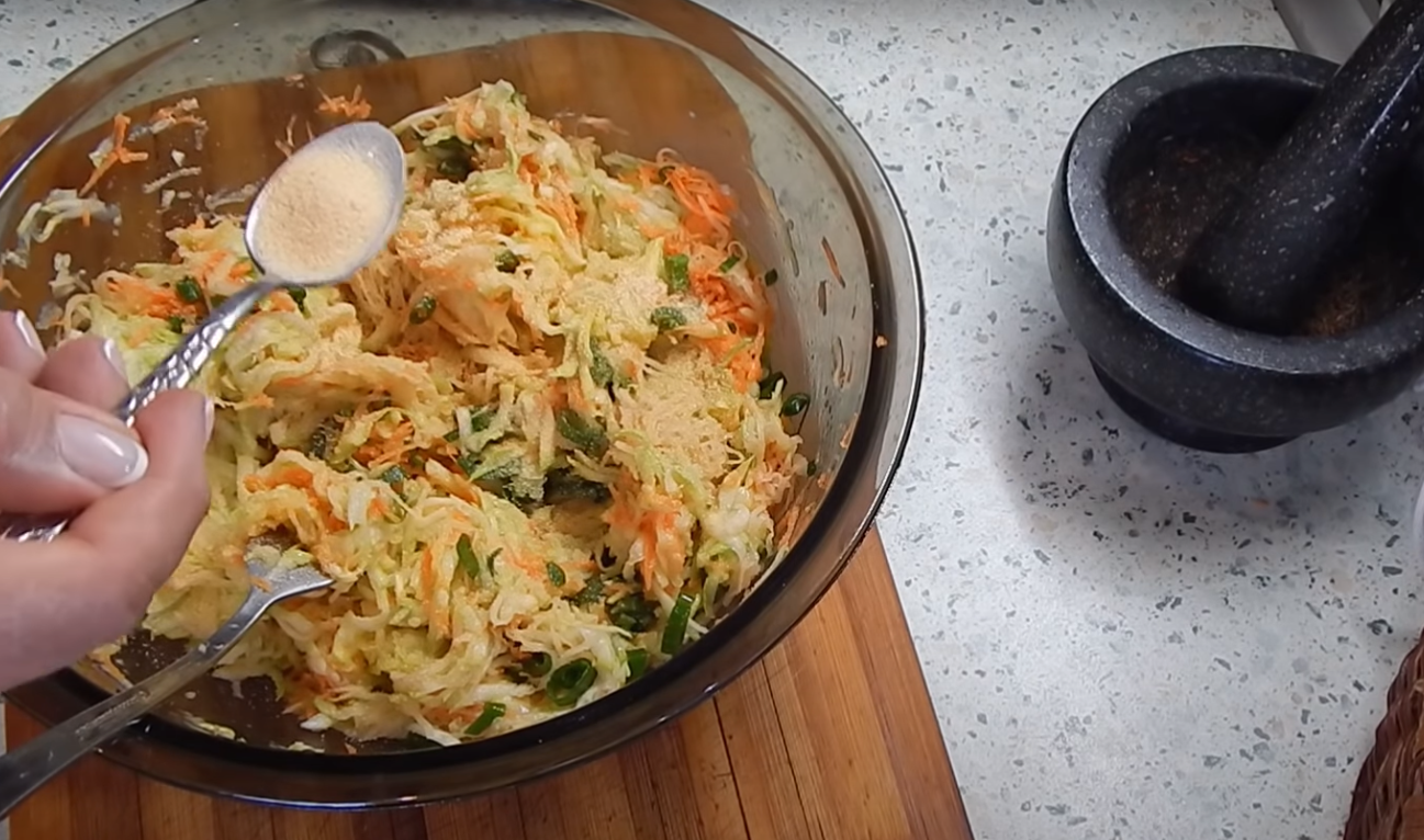 Należy go później odcisnąć i wylać. Do osobnej miski wrzuć drobno startą marchewkę i posiekaną cebulę. Ziemniaka zetrzyj na tarce, odciśnij sok i dodaj do marchewki i cebuli. Teraz dodaj cukinię, jajka i wszystko razem wymieszaj. Dodaj także granulowany czosnek.
