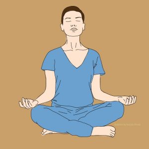 W pozycji tureckiej siedź, trzymając kręgosłup i głowę w jednej linii. Twoje ręce niech spoczywają na kolanach. Oddychaj głęboko i relaksuj się.