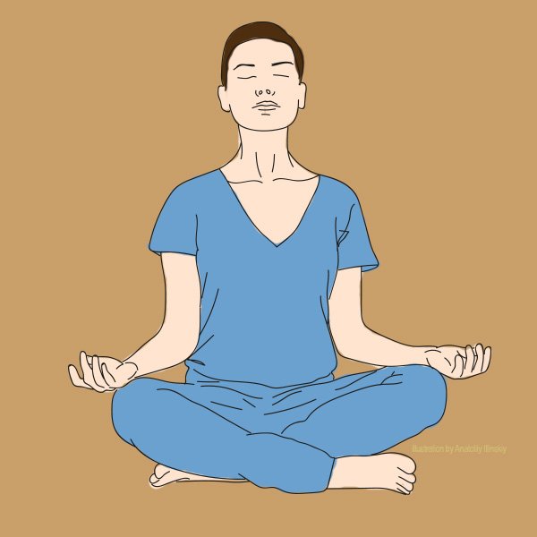 Usiądź ze skrzyżowanymi nogami, rozluźnij się i rozciągnij kręgosłup. Możesz lekko wyciągnąć szyję do góry, oprzeć dłonie na skrzyżowanych nogach. Wytrzymaj w tej pozycji przez kilka minut i oddychaj głęboko i płynnie. Pomoże to rozluźnić mięśnie.