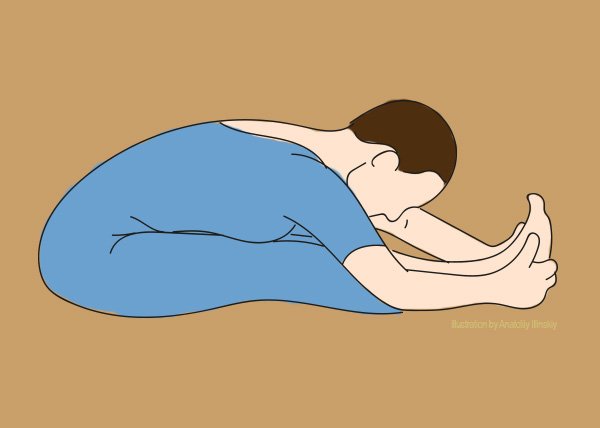 Usiądź, stopy wyciągnij przed sobą. Powoli spróbuj sięgnąć dłońmi palców u nóg. Skoncentruj się na rozciąganiu ciała podczas wydechu. W tym momencie ścięgna i mięśnie nóg są bardziej elastyczne i łatwiej jest osiągnąć ich maksymalne napięcie. Powtórz te ćwiczenie 5 razy.