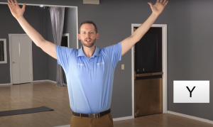Podnieś ręce do pozycji „Y”. Teraz cofnij dłonie tak daleko, jak to jest komfortowe. Poczuj ulgę w ramionach i klatce piersiowej! Teraz zmień pozycję na „W” i zatrzymaj na dwóch pełnych, głębokich wdechach. Zanurz się w uczuciu ulgi!