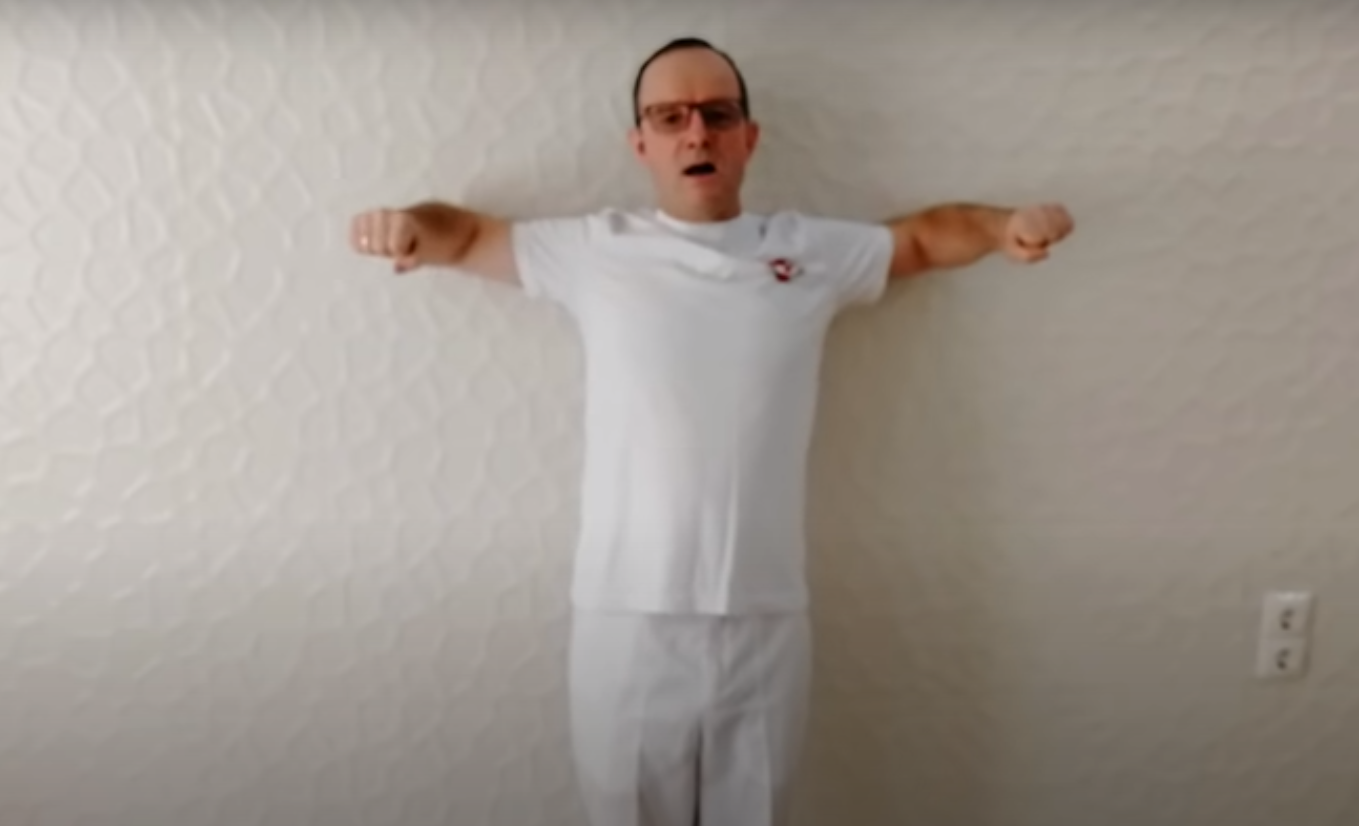 Stań tyłem do ściany, tak aby między tobą a ścianą był mały odstęp. Ramiona i łopatki mają być oparte o ścianę. Ułóż dłonie w taki sposób, aby zarówno przy łokciach, jak i ciało z dłońmi stanowił kąt prosty. Podczas wydechu łokcie mają być wepchnięte do ściany. Wykonaj ćwiczenie w 15-20 powtórzeniach.
